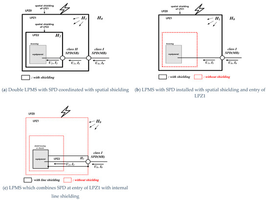 In general, lightning surges flowing into ESSs are generated by LEMP, which may cause damage to the structure and internal systems such as electrical, electronic, and communication systems [14]. In order to prevent LEMP in ESSs, this paper adapts the concept of LPMS through an SPD coordinated with spatial shielding. Namely, the LPMS is established in several forms according to the concept of the lightning protection zone (LPZ) for internal system protection, defined based on “IEC 62305-4”, as shown in Figure 2 and Table 1 [15]. Here, Figure 2a illustrates double LPMSs with SPDs coordinated with spatial shielding and Figure 2b shows an LPMS with an SPD installed with spatial shielding and the entry of LPZ1. Also, Figure 2c shows an LPMS which combines an SPD at the entrance of LPZ1 with internal line shielding. Here, Hn, Un and In represent the electromagnetic field and its induced voltage and current, respectively, which are defined in a range from 0 order to n order depending on the protection level [16].