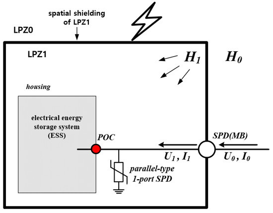 On the other hand, Figure 4 illustrates the existing structure of an LPMS with a parallel-type one-port SPD installed with spatial shielding and the entry of LPZ1. Here, the one-port SPD is connected in parallel to the POC in the power grid, which leads to increasing residual voltage depending on the length of the connection wire of the SPD. Furthermore, it is difficult to protect the ESS from switching and lightning surges because there is no clear technical guideline for the parameter values of SPDs installed in DC systems of ESSs. Therefore, this paper deals with an optimal operation method of SPDs and implements a test device featuring a third-class combination waveform for SPDs in ESSs in order to protect the ESS from switching and lightning surges.