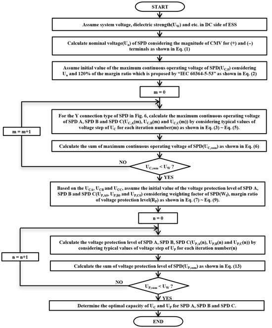 - [Step 8] Calculate the sum of the voltage protection level (UP,sum) as shown in Equation (13). If the UP,sum value is larger than the dielectric continuous voltage limit (UW) of the DC system in ESS, return to [Step 7] in order to decrease UP by typical values of voltage step (ΔUP); otherwise, go to [Step 9].where UP,sum: sum of voltage protection level.