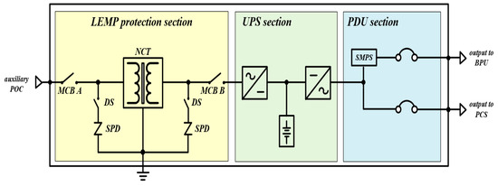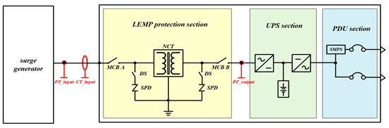 The implementation of a test device for SPDs in ESSs is illustrated as shown in Figure 8, where the test device for SPDs in ESSs is composed of PDU, UPS and LEMP protection sections. The LEMP protection section combines two units of one-port SPDs and DSs connected in parallel with two units of MCBs and NCTs in series. Furthermore, Table 3 shows the specification of the protection devices in Figure 8, which are selected by considering a 1 MW scaled power conversion system (PCS). Meanwhile, the standard for the insulation levels against voltage surge in electrical equipment connected to low-voltage systems is applied based on “IEC 60364-4-44”, as shown Table 4 [19]. Here, the surge voltage limit is selected as 1.5 kV, which corresponds to specially protected equipment at voltage levels of 230/400 V and 277/480 V.