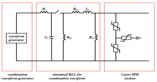 In order to validate the optimal operation method of SPDs, this paper implements a test device which is composed of the surge generator section of a third-class combination waveform and a one-port SPD section, as shown in Figure 9. Here, the surge generator section includes a combination waveform generator of 1.5 kV, a 1.2/50 μs surge voltage, a simulated RLC device of 0.75 kA, and a 8/20 μs surge current, which are applied based on IEC 61643-11 [20]. Also, the test scenarios of the third-class combination waveform for a one-port SPD are categorized in Table 5. Here, Case I is assumed to be an existing SPD (type A) adopted at ESS sites, which has UC and UP values of 1.5 kV and 4.5 kV, respectively, and Case II is an optimal SPD (type B) selected based on the proposed operation method, which has UC and UP values of 0.8 kV and 1.5 kV, respectively.