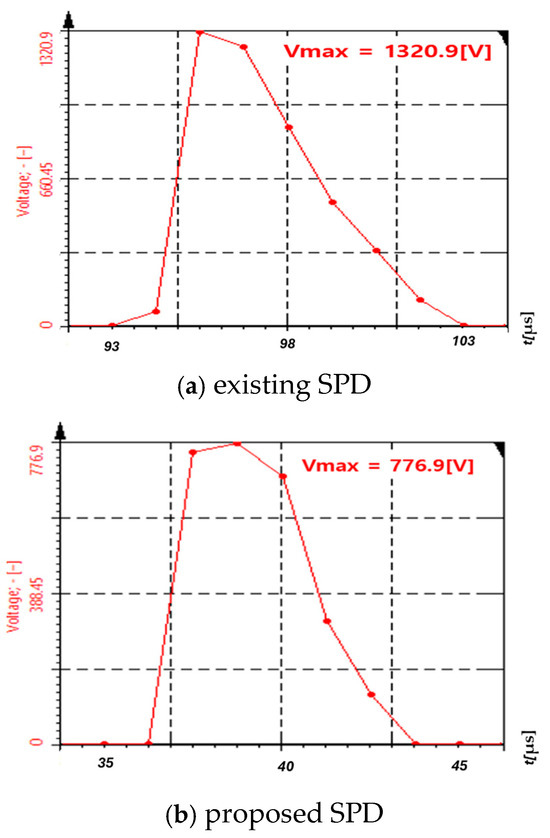 Based on the test conditions mentioned above, Figure 10 shows the residual voltage characteristics of a one-port SPD with a third-class combination waveform, measured by DEWE-571, with 300 kHz of input bandwidth and a 10 μs sampling time, which is the dominant term for peak detection. Figure 10a displays the residual voltage characteristics for the existing SPD application of Case I, and the maximum residual voltage for a 1.5 kV combination surge is obtained as 1.32 kV. Therefore, it is found that the surge protection is not performed effectively due to an 11.8% surge reduction rate, which is defined as the percentage value of reduced residual voltage with SPDs for a combination surge voltage. On the other hand, Figure 10b shows the residual voltage characteristics of the optimal SPD selected by the proposed operation method of Case II, and the maximum residual voltage for a 1.5 kV combination surge is obtained as 0.776 kV. Since the surge reduction rate is calculated as 48.2%, it is confirmed that the optimal SPD can improve the performance of SPDs by 36.4% compared to the existing SPDs and thus properly reduce switching and lightning surges.
