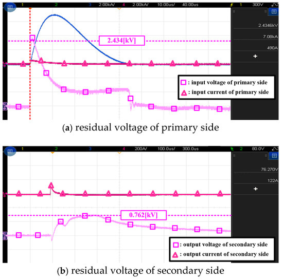 From the test results according to the test conditions mentioned above, the residual voltage characteristics with the third-class combination waveform in Case V are obtained as shown in Figure 12, where Figure 12a,b are the residual voltage characteristics of the SPDs on the primary and secondary sides, respectively. The maximum residual voltage of the SPD on the primary side for a 20 kV combination surge is obtained as 2.434 kV, with a value of 0.762 kV on the secondary side. Furthermore, it is known that the total surge reduction rate is calculated as 96.2%, and the residual voltage is kept within required surge voltage limit. Therefore, it is confirmed that the proposed two-port SPD can effectively reduce surges and then protect ESSs from switching and lightning surges.
