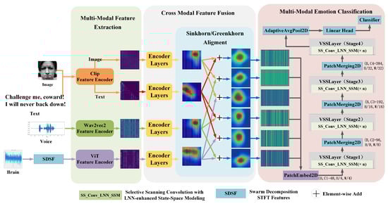 However, even with improved alignment, MER faces three persistent challenges: modeling long-range dependencies across asynchronous signals; extracting discriminative, high-resolution EEG features while suppressing modality-specific noise; and designing fusion mechanisms that avoid overfitting and generalize well in high-dimensional spaces. To tackle these issues, recent studies have progressively introduced more sophisticated sequence modeling architectures. Esernet [] uses Swin Transformer to boost speech emotion recognition by improving temporal sensitivity over CNNs. Transifc [] applies invariant cue-aware feature concentration for image classification, aligning modality-invariant signals. Mmatrans [] enhances transformers with muscle movement-aware attention for facial expression recognition. These works show a trend from basic feature fusion to modality alignment and context-aware temporal modeling, which informs our approach. Fuzzy clustering [] in MER can model uncertainty to enable soft alignment across modalities, while also facilitating time-series modeling of dynamic emotional variations [].