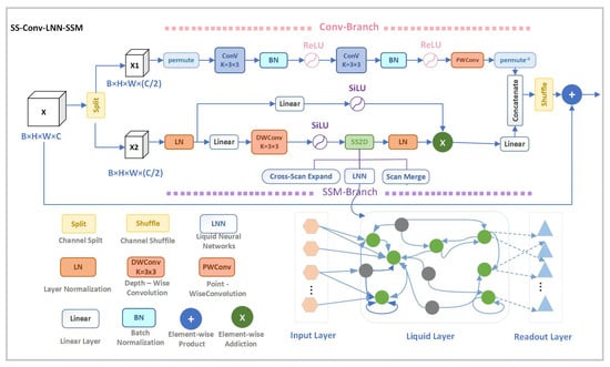 To integrate fine-grained spatial encoding and dynamic temporal adaptation, we extend SS2D with a dual-branch fusion structure: (1) a local convolutional encoder and (2) a global temporal branch using LNNs.