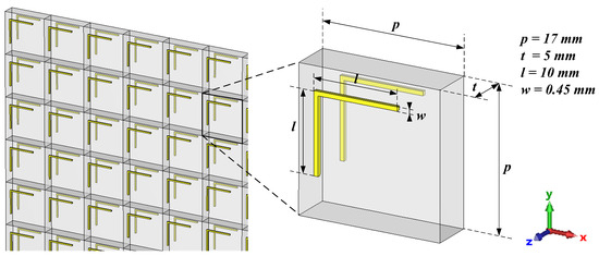 The metasurface unit cell (Figure 2) consists of an L-shaped low-carbon steel wire resonator (AWG-25, 0.455 mm × 0.455 mm cross-section, 20 mm total length) mounted on a low-permittivity foam substrate.