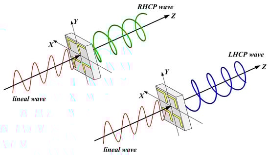 In recent years, metasurfaces—planar artificial structures composed of subwavelength resonant elements arranged periodically—have emerged as compact and highly efficient solutions for polarization conversion. These metasurfaces can manipulate amplitude, phase, and polarization at subwavelength resolution, enabling novel functionalities in ultrathin formats [8,9]. Several types of metasurface-based polarization converters have been reported, including cross-polarization converters, linear-to-circular converters, and handedness-switchable CP devices [10,11].