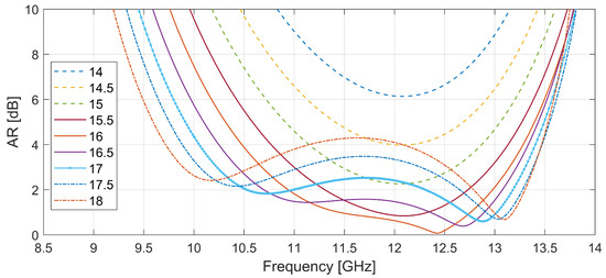 As an example of the optimization process, Figure 3 shows the AR of the transmitted signal as the unit-cell lateral size, p, varies from 14 mm to 18 mm in 0.5 mm increments, with slab thickness fixed at 5 mm and a two-layer configuration. The curve for mm highlighted yields the maximum bandwidth of 26%. A finer sweep of 0.1 mm around this preliminary optimum confirmed convergence when the relative bandwidth variation fell below . Although a further refinement could increase the bandwidth, it would do so at the expense of a higher average AR.