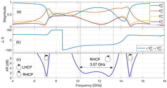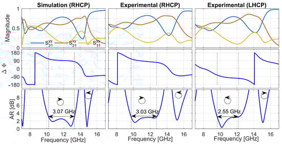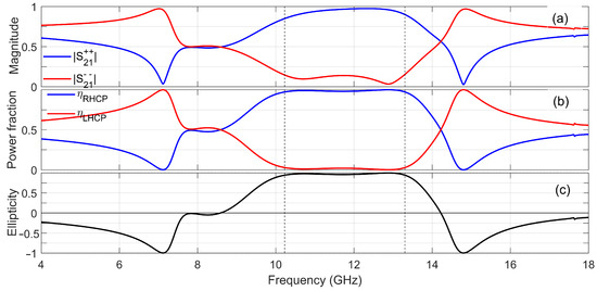 Figure 4 presents three key electromagnetic parameters used to quantify the polarization conversion performance of the selected design. We can observe that the cross-polarized transmission component is similar, in magnitude, to the co-polarized one between 10.2 GHz and 13.3 GHz (marked by vertical dashed lines). This fact, combined with the phase difference remaining close to , are the necessary conditions for CP.