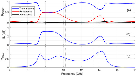 The simulation results confirm that the optimized two-layer achieves an efficient LTC polarization conversion in the 10.2–13.3 GHz band. Within this range, the amplitude and phase conditions required for RHCP transmission are simultaneously satisfied, yielding dB, high RHCP power content (), and normalized ellipticity . The energy-balance analysis further indicates low insertion losses (below 1.3 dB) and minimal absorption, demonstrating that the structure operates passively with excellent impedance matching. The conversion efficiency peaks around 65% and remains above 35% across the band, which is sufficient to achieve nearly circular polarization due to the favorable phase shift between orthogonal field components.