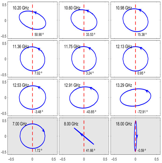 Figure 7 provides a visual reconstruction of the transmitted polarization ellipses at twelve representative frequencies, encompassing both those within and outside the main conversion band. Within the conversion band, the transmitted field is RHCP and presents a closed circular shape. In contrast, the LTC conversion band at 7 GHz is left-handed and also presents a quite circular shape with an AR of ≈0.6 dB. The plot for 8 GHz, between the first and second LTC bands, shows a LP transmitted wave rotated by ∼, indicating that the structure does not achieve circular conversion at this frequency. Finally, the plot for 18 GHz shows an almost LP wave aligned with the incident field.