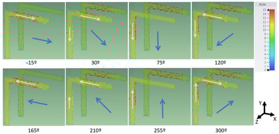 The induced fields then excite the front resonator. For ease of understanding, we represent the magnitude of the current vector in both arms with the help of a white arrow, and its vectorial sum (i.e., the total current) with a blue arrow in the center of the figure. We may observe that the current in both arms is lagged by approximately 90°, consistent with a capacitive coupling between both arms. The combination of two orthogonal transmitted field components—with nearly equal amplitude and 90° phase shift—leads to the generation of a counterclockwise rotation of the current vector, meaning the outgoing wave is an RHCP wave in the forward direction. This result being consistent with other linear to circular converters using different structures [15,18].