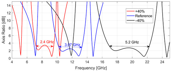 For instance, scaling down the geometry by 40% shifts the main resonance band to the 17.0–22.2 GHz range while preserving a significant bandwidth of ≈5.2 GHz, corresponding to a relative bandwidth of 26%, consistent with the original design. On the other hand, scaling up the structure by +40% moves the band to 7.2–9.6 GHz. In this case, although the LTC response is preserved, the axial ratio slightly increases to 3.4 dB at the center frequency. These results confirm that the design can be straightforwardly retuned across the microwave spectrum by adjusting the geometrical parameters.