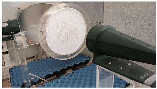 The measurement set-up used dual-polarized horn antennas for both transmission and reception, enabling independent measurement of the x and y field components. To minimize diffraction and spillover, an ellipsoidal reflector was employed to focus the incident beam onto the sample. The transmitting horn was placed at one focal point of the reflector and the sample at the other [29]. The receiving horn was positioned co-focally on the opposite side, with its polarization axis orthogonal to that of the transmitter to facilitate cross-polarization measurements. Figure 10 shows a photograph of the measurement set-up and a schematic of the unit cell.