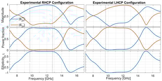 The experimental measurements closely validate the simulated predictions for the optimized dual-layer metasurface (Table 3). The main LTC conversion band is observed between 9.7 and 12.8 GHz in the RHCP configuration, preserving the simulated 26% relative bandwidth, and between 9.6 and 12.2 GHz in the LHCP configuration, corresponding to a slightly narrower 24% bandwidth.