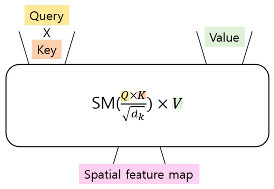 The self-attention weights are computed using the dot-product and the SoftMax (SM) function, as defined in Equation (5).