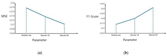 SPOT performance changes as the CNN encoder changes: (a) MSE versus parameters; (b) F1-score versus parameters.