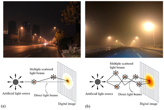 As shown in Figure 1, particulate matter participates in the scattering and plays a significant role in booming the glow that is observed around light sources. The impaired nighttime scene is often characterized via the standard nighttime haze model [27]: