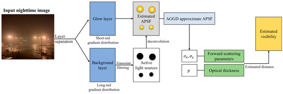 To derive a weather index from a smartphone photo, we were inspired by the common-sense observation that the naked human eye can easily distinguish an ambient environment at night using visual properties (e.g., size and shape of the glow) without additional knowledge. A schematic overview of the proposed algorithm is shown in Figure 2. Given a smartphone photo, we first separate the layer from photographs that only contain the glow effects, i.e., the glow layer, by assuming the photographs with haze are a linear combination of multiple layers (see Section 3.1). APSF presents how the intensity around the light source propagates and diminishes, estimated from the area where the artificial light source is detected (see Section 3.2). The APSF is then fitted by an asymmetric generalized Gaussian distribution (AGGD) filter [23,32]; two weather indices, that is, the optical thickness index and the forward scattering index, can be calculated from the AGGD parameter [23] (see Section 3.3). Using weather indices, the visibility distance can then be estimated using the proposed model (see Section 3.4).