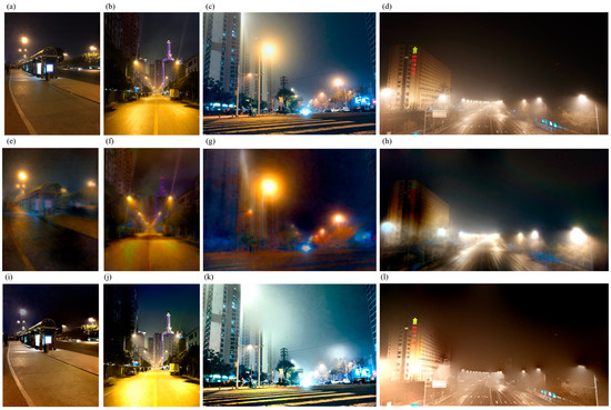 Four examples of nighttime smartphone photographs (a–d) from clear mist to heavy haze; glow layers (e–h); and de-glow layers (i–l) from smartphone photos.