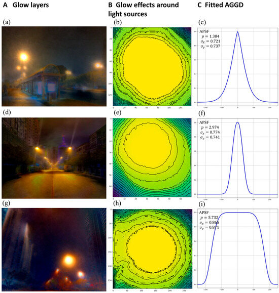 Examples of glow under three weather conditions, glow effects around light sources, and fitted parameters under three different visibility levels. (A) Glow layers of the nighttime hazy images under different visibility levels—high (a), medium (d), and low visibility (g). (B) Iso-brightness contours of the glow effect around light sources showing asymmetric concentric rings—high (b), medium (e), and low visibility (h). (C) APSF fitted by AGGD—high (c), medium (f), and low visibility (i).
