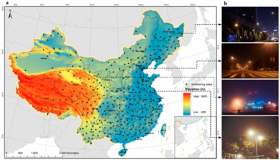 The spatial distribution of visibility monitoring sites, the geography of Weibo posts, and examples of crowdsourced photographs. (a) The spatial distribution of 319 visibility monitoring stations in mainland China. (b) Four examples of web-crawled nighttime smartphone photographs from Weibo (i.e., clear night view, lightly hazy night, medium-hazy night, and heavily hazy night).