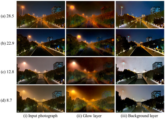 To evaluate the separated glow layer following the above restrictions, photographs taken at the same scenario were selected, and the corresponding layers were compared, as shown in Figure 6. For a clear night (Figure 6a,b), the background layers (Figure 6(a-iii,b-iii)) look very similar to the observed photograph; the differences are mainly at the light sources. This proves that the separation approach correctly captures the necessary information about the presence of haze and does not introduce unwanted information from the background. For the hazy night (Figure 6c,d), the extent of the glow is significantly magnified. This makes evidence that the separation approach has a strong ability in extracting the hazy information under heavy haze conditions. Although we may notice that the glow layers appear to include some background scenes (e.g., trees, rivers, or bridges), we argue that residual information is inevitable for this probability-based approach, as each pixel of the glow layer must have a probability value. In addition, this residual information will be excluded in the forthcoming procedures.