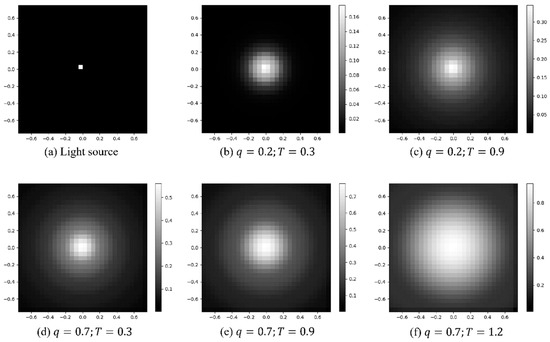 To test the reliability of the AGGD in fitting the projected APSF, we first simulated APSFs, convolved them with a given light source to produce glows, and then projected glows into a two-dimensional plane; the simulation algorithm was the same as that presented in [21,22]. The simulated glows given by different weather parameters are shown in Figure 7. The AGGD was then applied to fit these simulated glows. Table 4 lists the fitted AGGD parameters and a comparison with the simulated parameters. As expected, the fitted results and the simulated parameters are very similar. This consistent and similar pattern reveals the high accuracy of using AGGD to fit glows.