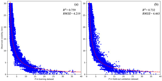 The performance of the visibility estimation model between the optical thickness index () and the visibility value in the fitting dataset (a) and the Hold-out validation dataset (b). The red-dashed lines are the best-fitted lines for the linear regression model.