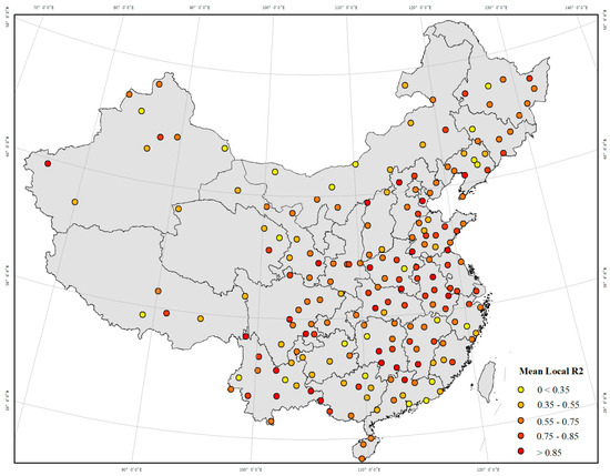 To further explore the spatial heterogeneity in model fitting performances, local were calculated and are presented in Figure 9. In general, the overall average local is 0.67, with >25% of the local are greater than 0.8. Particularly, the spatial distribution of the average local reveals that the higher values often correspond to more polluted areas, such as eastern China and urban centers like provincial capitals. Conversely, while overall might be lower in some parts of western China (e.g., Tibet Autonomous Region, Xinjiang Uyghur Autonomous Region, and Inner Mongolia), specific urban centers within these regions show great disparities and had high local values, such as Lhasa (0.769), Urumchi (0.827), and Hohhot (0.934). The detailed quantitative analysis demonstrates the model’s capability to handle spatial and temporal variations, allowing for robust estimation of nighttime visibility under diverse conditions.