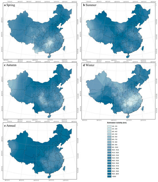 The spatial distributions of predicted mean nighttime visibility: (a) spring, (b) summer, (c) autumn, (d) winter, and (e) annual average.