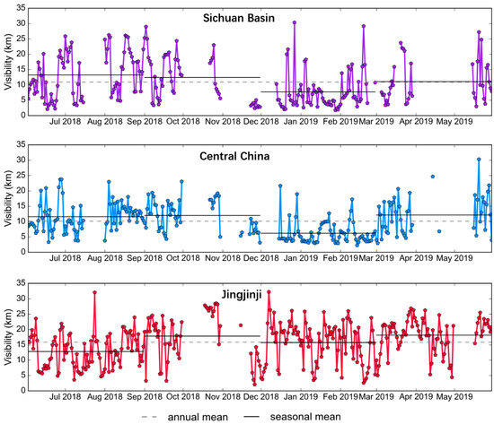 Time series of estimated nighttime visibility for three pollution hotspot regions. The variations of nighttime visibility in the Sichuan Basin, central China, and the Jingjinji region exhibit different trends. Gaps in the time series represent days with insufficient crowdsourced images and the lack of ground truth. The dashed line represents the annual average visibility, and the solid line represents the annual average visibility values for each season.