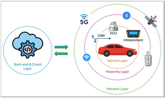 The Vehicle Layer encompasses onboard physical components such as Electronic Control Units (ECUs), communication buses (e.g., CAN), telematics systems, infotainment units, sensors, and digital keys. The Proximity Layer includes short-range communication interfaces, such as Bluetooth, Wi-Fi, Vehicle-to-Vehicle (V2V), Vehicle-to-Infrastructure (V2I), and keyless entry systems. The Network Layer addresses external connectivity technologies, including LTE/5G, satellite links, mobile hotspots, and Intelligent Transportation System (ITS) infrastructure. Finally, the Backend and Cloud Layer focuses on interactions with public and private cloud services, OEM infrastructure, blockchain platforms, and third-party backend systems [].