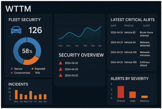 The implementation of the WTTM framework followed an iterative, modular approach, characterized by the progressive release of integrated software and hardware components. At the core of the system is a Cyber Risk Assessment Platform, designed to automate compliance with international standards—such as ISO/SAE 21434 and UNECE WP.29—and to automatically generate a Maturity Card, which provides a dynamic snapshot of the cybersecurity posture of a vehicle or fleet.