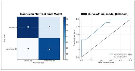 Figure 3 provides a comprehensive overview of the performance of the final classification model (XGBoost). The confusion matrix on the left illustrates the model’s ability to correctly classify most configurations, with a high number of true positives (vulnerable profiles correctly identified) and true negatives (secure profiles correctly classified), and relatively few misclassifications. This balance reflects the model’s reliability in both detecting cybersecurity risks and avoiding unnecessary false alarms.