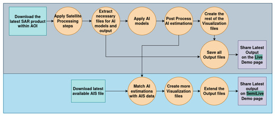 The platform features two modes: NearRealTime (or Live) and AfterNextDay (or SemiLive). The NearRealTime mode uses the most recently released Sentinel-1 SAR products, which are typically accessible approximately seven hours after image acquisition. The AfterNextDay mode integrates AI-based analysis of SAR imagery with AIS data. This version is subject to a three-day delay, as the corresponding historical AIS data becomes available after that period. All necessary steps can be viewed in Figure 1.