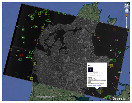 Figure 4 illustrates a SAR satellite image seamlessly integrated into the Google Earth interface. Each detected vessel is marked by a color-coded rectangle corresponding to its classification status—matched (green), dark (red), or unmatched (yellow). When a user clicks on a vessel marker, a detailed information panel appears, combining AI-derived detection insights from the “NearRealTime” mode with AIS data. This integrated view enables users to explore and analyze each vessel’s identification, classification, and estimated characteristics in a single, intuitive interface.