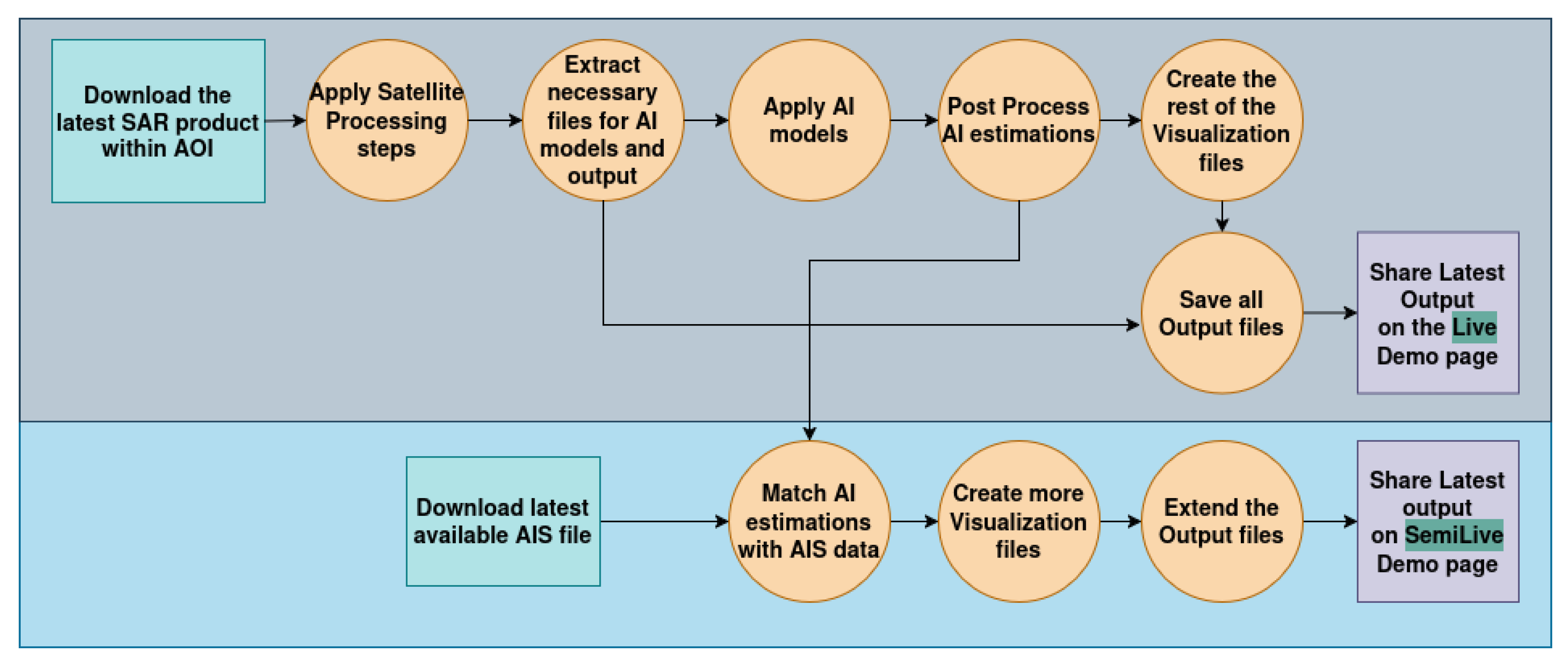 The platform features two modes: NearRealTime (or Live) and AfterNextDay (or SemiLive). The NearRealTime mode uses the most recently released Sentinel-1 SAR products, which are typically accessible approximately seven hours after image acquisition. The AfterNextDay mode integrates AI-based analysis of SAR imagery with AIS data. This version is subject to a three-day delay, as the corresponding historical AIS data becomes available after that period. All necessary steps can be viewed in