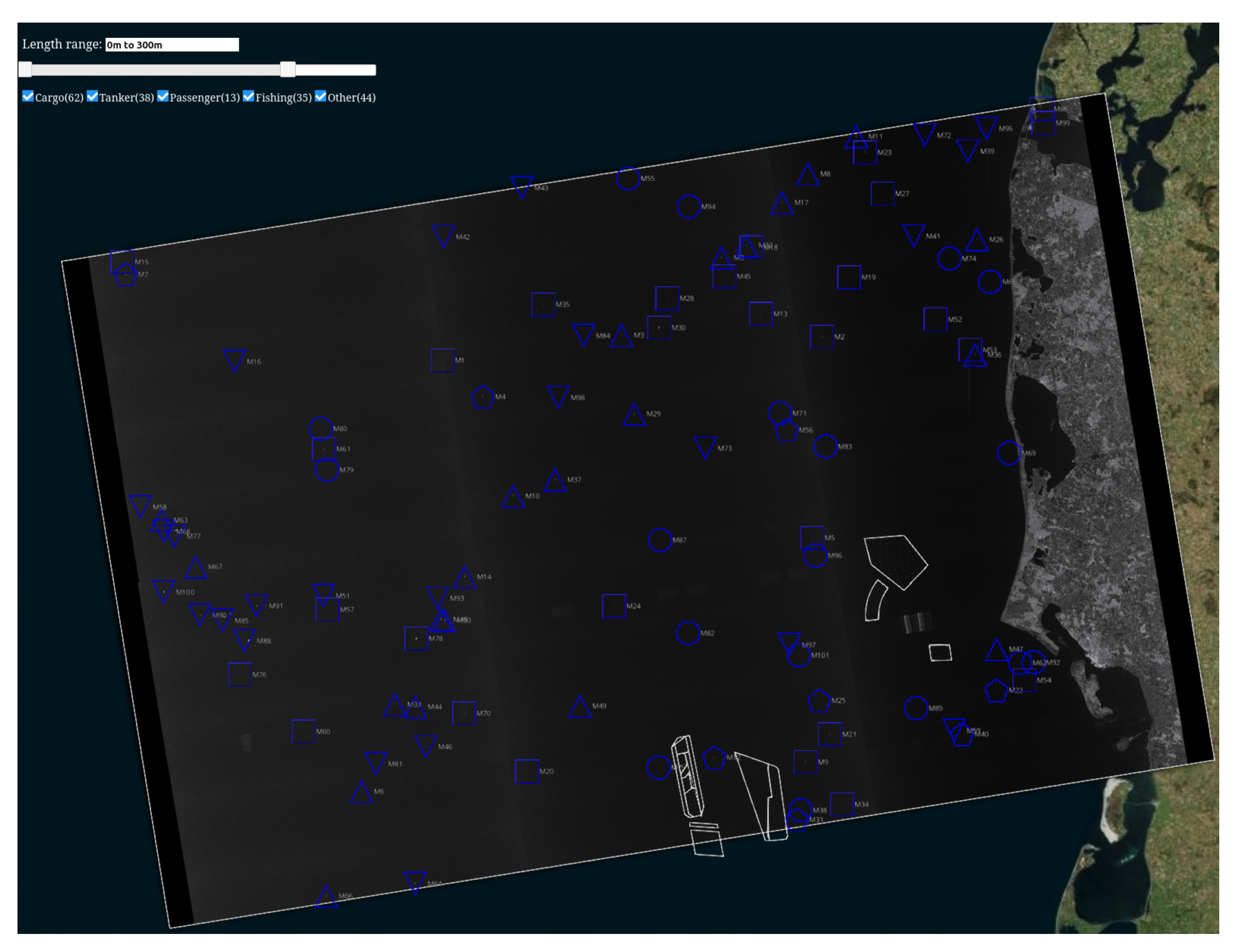 Figure 3 illustrates a demonstration of the “NearRealTime” mode, showcasing an SAR satellite image overlaid on a global map interface. The visualization is enriched with AI-driven ship detection and classification results. Each detected vessel is represented by a distinct geometric symbol corresponding to its estimated type, such as cargo, tanker, or fishing vessel. Users can interact with individual vessel markers to access additional information, including an estimated ship length. This interactive layer provides a clear and intuitive overview of maritime activity as analyzed in near-real time by the system.