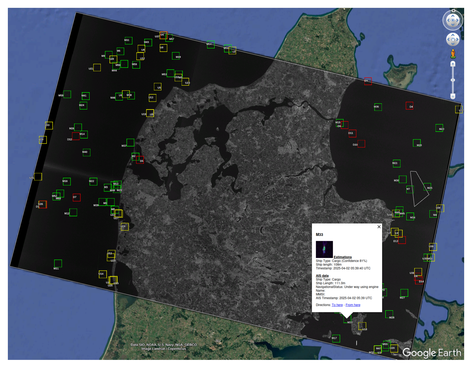 In the “AfterNextDay” mode, the outputs from the “NearRealTime” processing are further extended. Each detected vessel is categorized into one of three classes based on its association with AIS transmissions: matched (correlated with AIS data), dark (no corresponding AIS signal), or unmatched (insufficient data for a definitive match). To facilitate this classification process, the large AIS dataset is initially sub-sampled to match the spatial coverage and acquisition time of each satellite product, thereby reducing its size. These tailored subsets are then combined with the AI-generated estimations using a straightforward custom proximity algorithm. The resulting fused data is used to produce new KML files, enabling detailed visualization and further analysis.