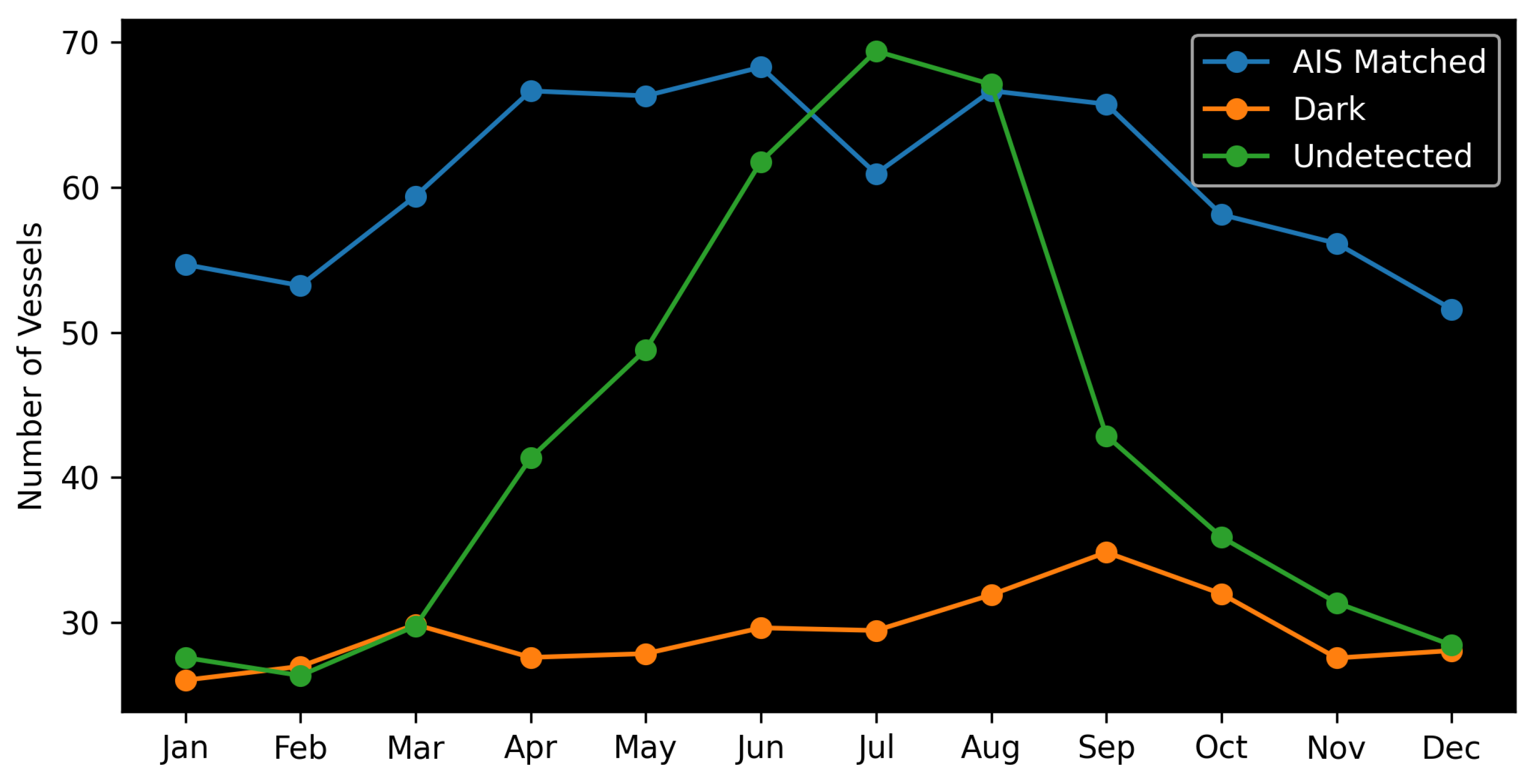 Figure 5 presents the monthly average number of vessels detected in satellite SAR imagery after cross-referencing with AIS data from the corresponding areas and time periods. The blue line represents vessels successfully detected by our AI models that also have matching AIS records. Monthly variations in vessel counts are primarily attributed to fluctuations in maritime activity. The green line indicates vessels with AIS signals that were not detected by our models. These undetected vessels show significant seasonal variation, with the majority occurring during the summer months. This is likely due to an increase in small fishing and recreational vessels during this period, which are more challenging to detect in Sentinel-1 imagery. The orange line denotes vessels detected by our models for which no corresponding AIS data were found. These may include so-called “dark” vessels, as well as potential false positives. A qualitative assessment of the “AfterNextDay” monitoring interface suggests that many of these “dark” detections are located far offshore, beyond the range of terrestrial AIS receivers. Given the known limitations of AIS coverage due to the Earth’s curvature, such cases highlight the value of satellite SAR, which extends vessel detection capabilities beyond traditional AIS reach.