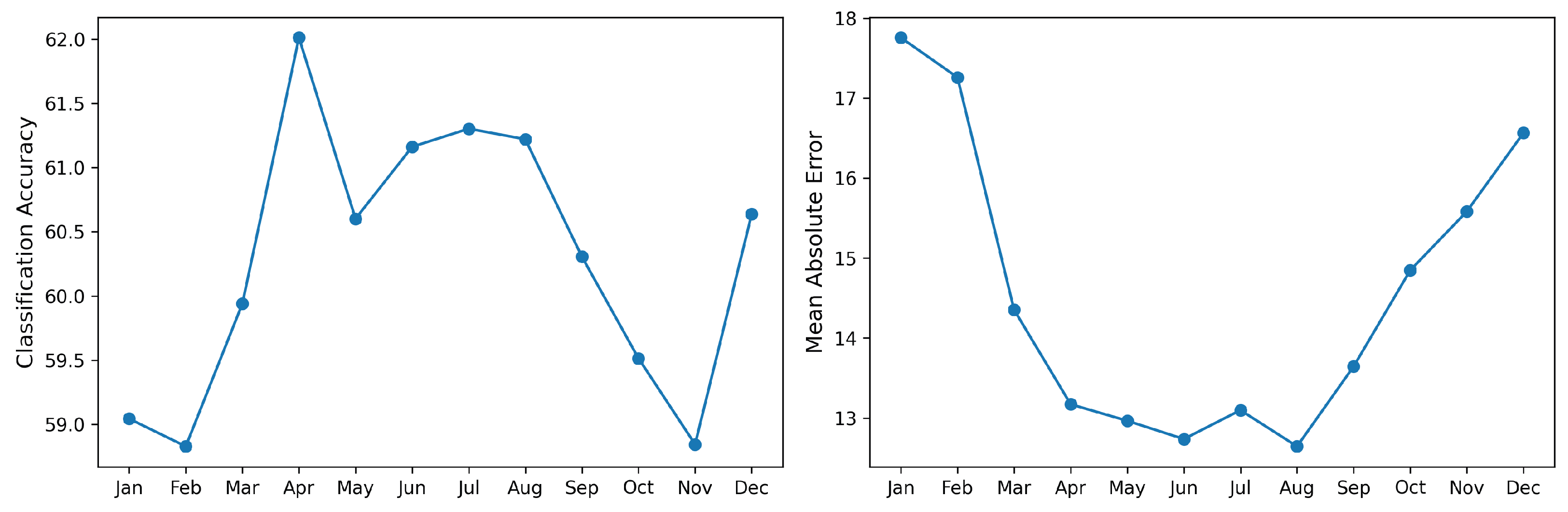 Figure 6 illustrates the monthly performance of the ship type classification and ship length estimation models. The two metrics exhibit similar seasonal trends. Although they represent opposite scales, where higher classification accuracy is preferable and a lower mean absolute error (MAE) is desired, they both reflect improved performance during the same periods.