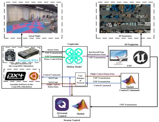 The Rflysim simulation platform consists of flight control modules, Coptersim modules, 3D display modules, swarm control modules, and vision control modules. This platform can provide UAV flight simulations based on the UE engine, and can simulate the flight control controller environment and control command transmission in real time. The architecture of the Rflysim platform and its 3D simulation are shown in the following