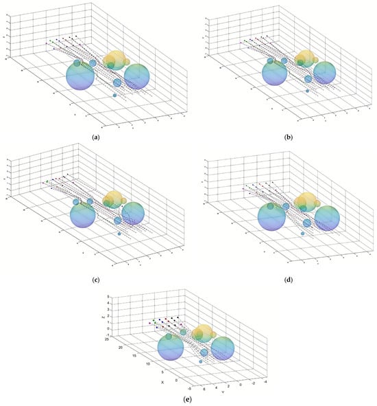 The UAVs needed to maintain a column formation to pass through the narrow passage while avoiding mutual interference. During this process, individual UAVs might need to make minor altitude or speed adjustments to ensure the overall passage of the formation. In a narrow space, a minor deviation of an individual UAV might lead to the instability of the overall formation structure. Therefore, strict path control and dynamic obstacle-avoidance strategies were required. The simulation diagram is shown as follows in