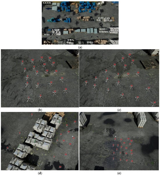 This paper first simulated an industrial warehousing environment where the passage width was narrow, and UAVs needed to maintain a relatively close distance to complete the obstacle-avoidance task. The design intention of this scenario was to verify the inter-UAV obstacle-avoidance ability of UAVs in high-density environments and the stability of the formation during group flight.