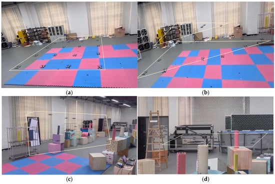 On the basis of completing the simulation experiments, this study further conducted 3D simulation and real-flight experiments to verify the feasibility and effectiveness of the proposed formation cooperative control strategy based on non-cooperative games in actual scenarios. The experiments were carried out in an indoor flight laboratory. The experimental environment was similar to that of the simulation experiments, with multiple static and dynamic obstacles set up to simulate UAV formation tasks in complex environments.