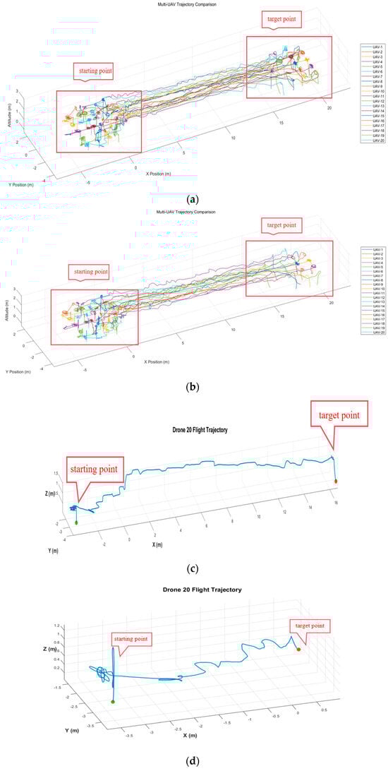 Figure 13 provides a detailed comparison between the proposed IVYA-Nash method and the conventional Artificial Potential Field (APF) approach. Subplots (a) and (b) illustrate the 3D flight trajectories of 20 UAVs under both methods. With APF (subplot a), multiple UAVs exhibit unstable flight and collision tendencies, leading to eventual crashes due to aerodynamic interference, especially among vertically stacked drones. In contrast, our method (subplot b) ensures smoother trajectories and stable convergence toward the target points, maintaining the swarm formation without collisions. Subplots (c) and (d) further present the individual flight paths of UAV #20 under APF and our method, respectively. The APF-based trajectory (subplot c) shows significant oscillations and instability, while the IVYA-Nash trajectory (subplot d) remains smooth and successfully reaches the target. These results highlight the superior robustness, safety, and autonomous formation recovery capability of the proposed approach in cooperative multi-UAV control.