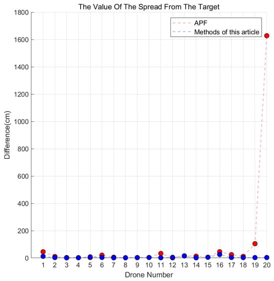 Figure 14 quantitatively characterizes the terminal positioning accuracy during formation assembly through box plots, where the box spans reveal error distribution characteristics. Experimental results demonstrate that our method achieves an average total-distance positioning error of 5.39 cm, representing a 94.5% accuracy improvement over the conventional potential field method’s 99.1 cm. Error distribution analysis shows our method maintains a stable median error of 5.12 cm, while the baseline exhibits significant outliers. This validates the proposed method’s millimeter-level precision and robust anti-interference capability in terminal positioning phases.