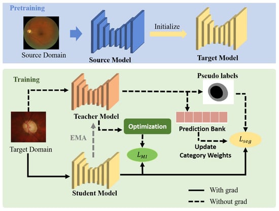 To address the aforementioned issues, we propose Mutual Information Maximization and Prediction Bank (MIMPB), a source-free domain adaptation approach for medical image segmentation. The algorithm formulates an optimization problem consisting of two key modules. First, the mutual information maximization module minimizes the relative entropy between pseudo-labels and model output probabilities, effectively reducing the discrepancy between distributions and naturally mitigating pseudo-label noise. This approach aims to fully utilize the information in high-quality labels, thereby reducing the uncertainty in the generated data. Second, the prediction bank effectively addresses the foreground–background imbalance in medical images by analyzing global statistics across the entire dataset. By storing prediction results of all pixels and calculating separate average losses for foreground and background classes, the prediction bank calibrates the loss function to ensure balanced learning between classes, significantly improving segmentation accuracy for minority classes like the optic cup. These two components work synergistically within a teacher–student framework to enhance model stability and performance for source-free domain adaptation in medical image segmentation tasks.