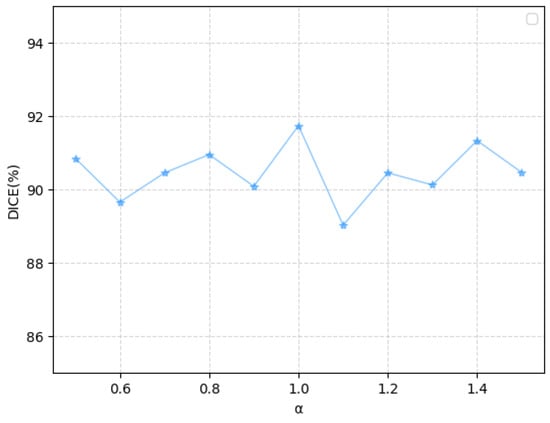Additionally, this section performs a sensitivity analysis of the loss coefficient , as shown in Figure 2. The DICE coefficient here represents the average value of the cup and disc results. From the analysis, it can be observed that the DICE coefficients corresponding to different loss coefficients generally fall within the range of 90–92%. This data strongly demonstrates the algorithm’s stability with respect to the loss coefficient. Further observation reveals that when  is set to 1.0, the model shows the best performance. This phenomenon suggests that when the ratio of segmentation loss to mutual information loss is balanced, the model achieves the optimal segmentation results.